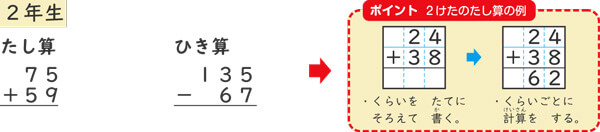 たし算・ひき算での間違いが多くなるのは、くり上がり・くり下がりの計算からです。1年生では横式で、2年生からは筆算での計算を学習しますが、簡単なようでいて間違いの多いところです。