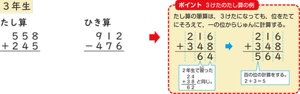 算数は繰り返しの学問です。例えば、くり上がりのたし算は1年生では横式で、2年生からは筆算で学習しますが、3年生でも計算するケタ数が違う筆算を学習します。