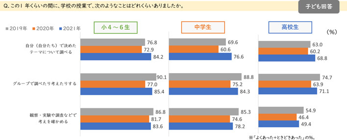 2020年は、学校の授業において「自分(自分たち)で決めたテーマについて調べる」「グループで調べたり考えたりする」「観察・実験や調査などで考えを確かめる」といったアクティブ・ラーニング型の取り組みが減っていました。