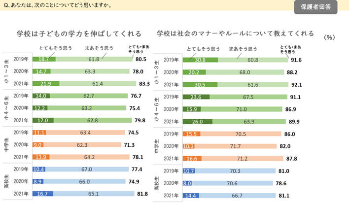 次に、学校に対する保護者の意識についても「学校は子どもの学力を伸ばしてくれる」や「学校は社会のマナーやルールについて教えてくれる」に「とても+まあそう思う」と回答した保護者が、2019年から2020年にかけて減少したものの2021年にかけては増加しました。(図2)