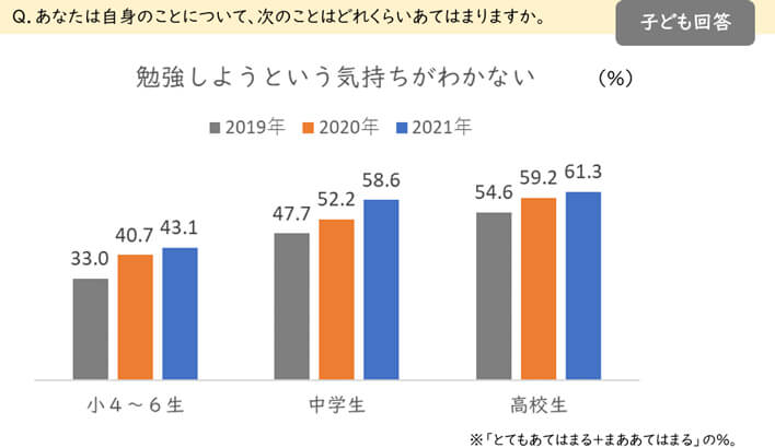 「勉強しようという気持ちがわかない」に、「とても+まああてはまる」と回答した子どもの割合は、小学生・中学生・高校生ともに、2019年、2020年、2021年と増加しています。(図3)
