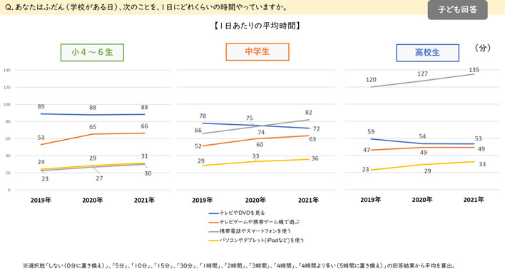 2020年ステイホームの影響により増加した「テレビゲームや携帯ゲーム機で遊ぶ」「携帯電話やスマートフォンを使う」「パソコンやタブレットを使う」時間は、2021年も増加したままでした。(図4)
