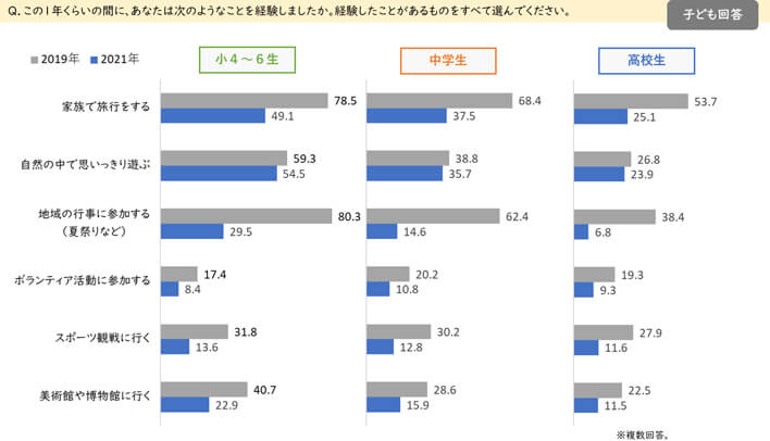 「家族で旅行をする」「自然の中で思いっきり遊ぶ」「地域の行事に参加する(夏祭りなど)」「ボランティア活動に参加する」「スポーツ観戦に行く」といった社会的、自然的体験は2019年と比べて大きく減少しました。また、「美術館や博物館へ行く」といった文化的体験も同様に減少しています。(図5)