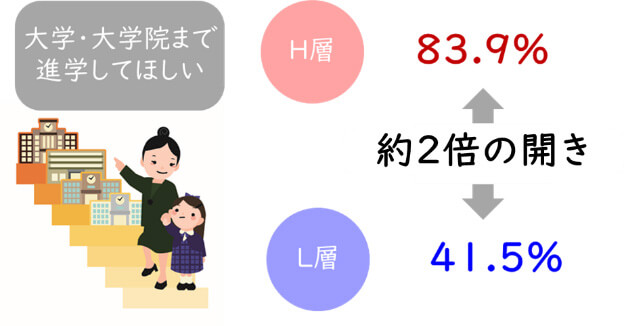 これも、H層とL層では約2倍の開きがあります。そして、私たちの分析では、進学期待のような子どもの教育に対する意識のほうが、実際にかけている教育費よりも、学力や学業成績に強く影響していました。進学期待によってさまざまな働きかけが変わるため、それが最終的に成果に結びつくのだと考えられます。