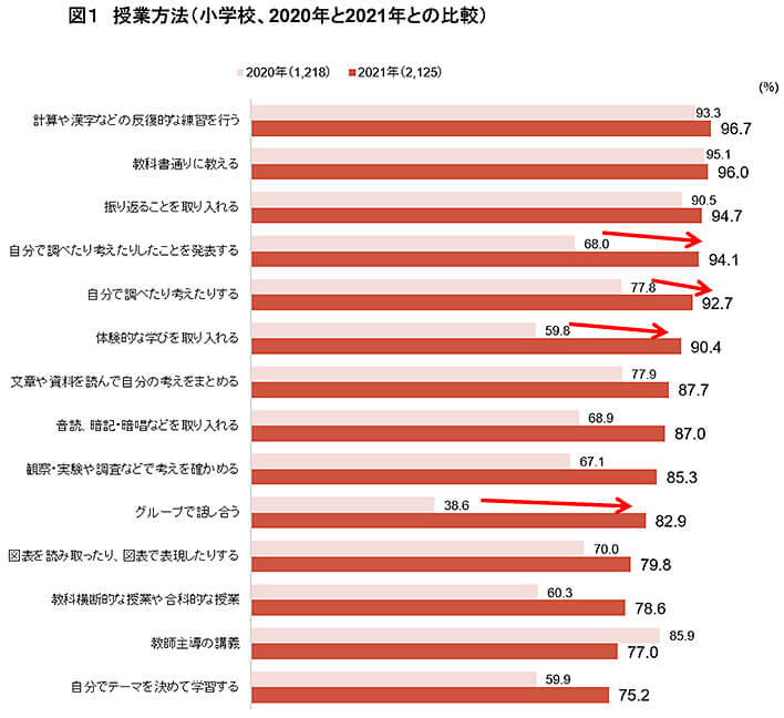 小中学校でのそうした変化は、小学校では2020年度から、中学校では2021年度からスタートした新学習指導要領に基づき、学校が子どもの「主体的、協働的で深い学び」や「思考力・判断力・表現力の育成」を重視しているからだと考えられます。
