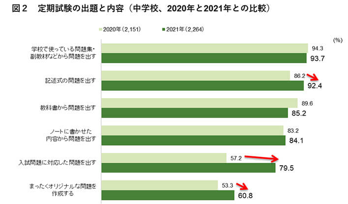 図2は、中学校の定期試験の出題について尋ねた結果です(ベネッセ調査)。2020年と比較して、2021年は「記述式の問題を出す」「入試問題に対応した問題を出す」「まったくオリジナルな問題を作成する」が増えています。