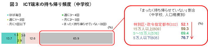 図3をみてください。中学校では、端末を家庭に持ち帰って、家庭学習に活用しているのは約22%(「月に2~3回」~「ほぼ毎日」)で、「まったく持ち帰らせていない」割合は約66%に上ります。「まったく持ち帰らせていない」のは、人口規模が小さい自治体ほど多い状況でした。同様の傾向は小学校でも見られました。