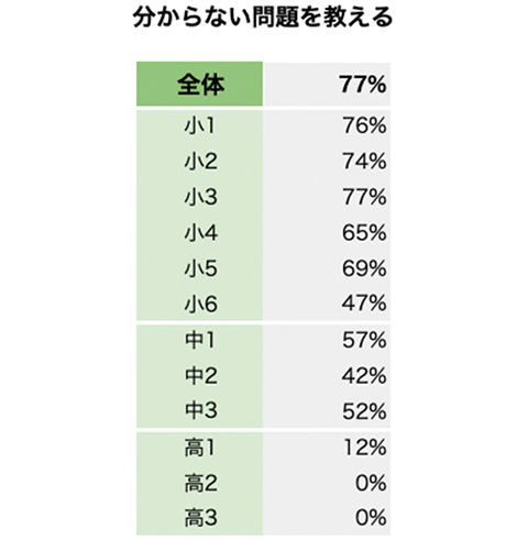 全体で2位(66%)となった「分からない問題を教える」は、特に小5までで高い数値となりました。学習内容も難しくなる小6以降は保護者のサポートの有無も二極化。高校では保護者が分からない問題を教えることは稀になるようです。