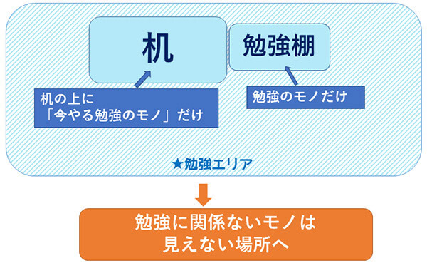 このように東大生の先輩たちが実践しているモノの置き場所を「勉強」「それ以外」にエリア分けすることは、お子さまの気持ちを勉強モードに自動的に切り替えやすく、かつ探し物をしないためにも、大切なテクニックです。