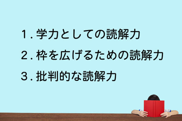 私自身は、読解力にはいくつかの種類があると考えており、大きくは3つ、大事な読解力があると思います。
