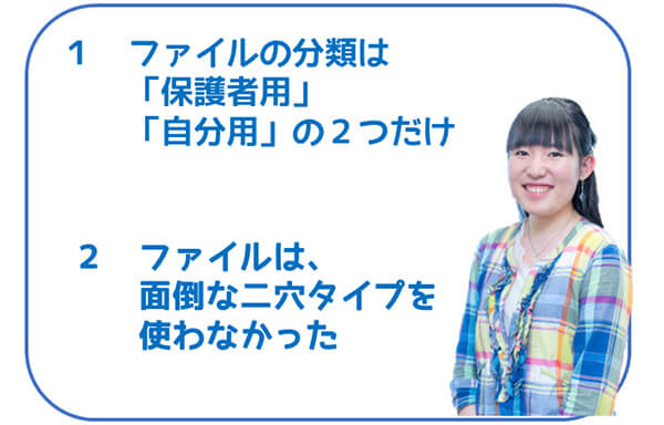 「プリントがたまらないうちに定期的にファイルをチェックして必要ないプリントを捨てていましたね。内容を見て理解できているものは、捨てる。