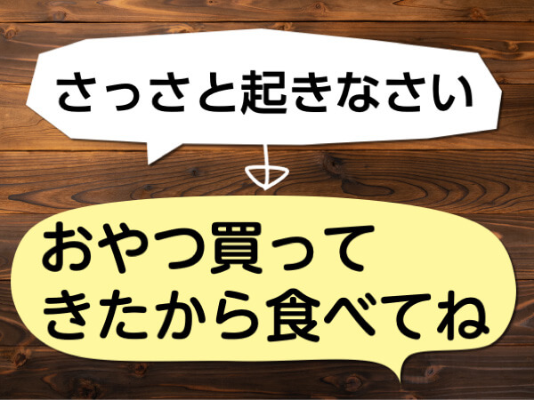 「さっさと起きなさい」→「おやつ買ってきたから食べてね」