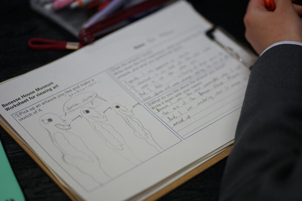ベネッセハウス ミュージアムで取り組んだ作品鑑賞ワークシート。印象に残った作品をスケッチし、作品の第一印象やどこからその印象を抱いたかをそれぞれまとめました。