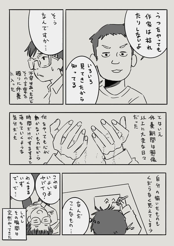 年2回、投資家たちとマンガ家2人が参加する活動報告会が開催されます。そこでの楽しみは、半年間の収益報告ではなく、マンガによる2人の活動報告。今描いている作品の話だけでなく、抱えている悩みもマンガに描かれていて、味わい深いです。