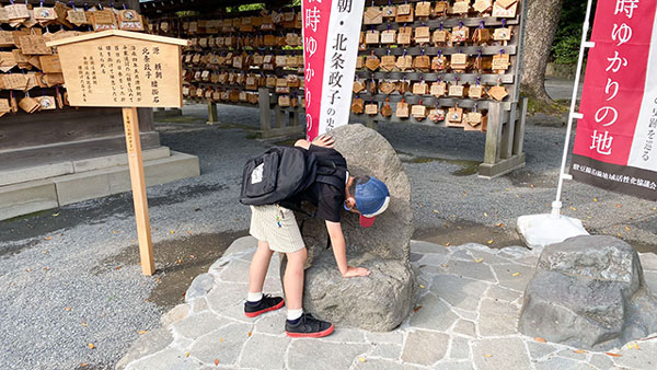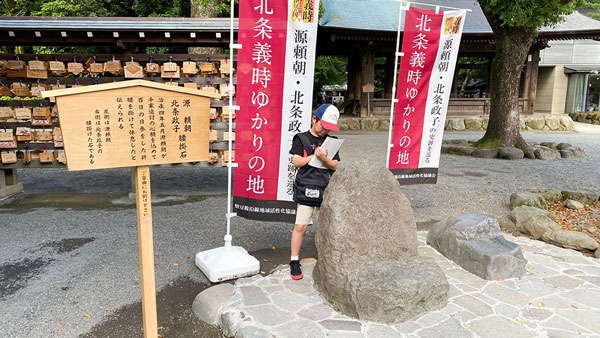 「鎌倉殿の13人」にも登場する三嶋大社内の腰掛石。見学者は実際に腰掛けることができる。
