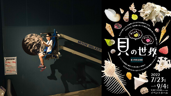 写真提供:多摩六都科学館。写真左「ムーンウォーカー」は体重22kg以上70kg未満、身長110cm以上対象。写真右「夏の特別企画展 見てみるカイ? おくぶカイ! 貝の世界」は、2022年7月23日(土)~8月31日(水)、9月2日(金)~9月4日(日)に開催。