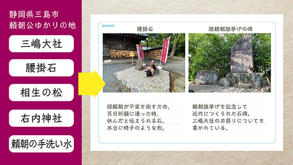 静岡県三島市で源頼朝の伝説を調べた例。「3ステップで簡単!まとめまで完成 自由研究ラボ」のテンプレートを使用。写真を貼ってコメントをそえていけば、自由研究がまとまる。