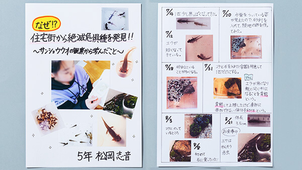 「なぜ!? 住宅街から絶滅危惧種を発見!!~サンショウウオの観察から学んだこと~」。松岡志音さん(鳥取県)の作品。