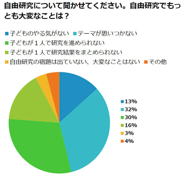 自由研究で保護者がもっとも大変だと感じていることについては、1位が「テーマが思いつかない(33.2%)」、2位が「子どもが1人で研究を進められない(28.3%)」でした。合わせて約6割の保護者が「テーマ選び」「研究の進行」に悩んでいるようです。