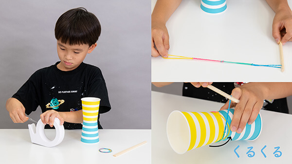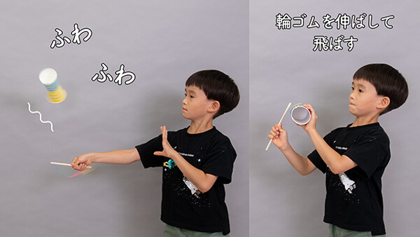 小学1年生の中村征楽(せら)さん(7歳)が挑戦したのは、紙コップロケットの実験。2つの紙コップをセロハンテープでつなげ、輪ゴムをわりばしに取り付けたら準備完了。輪ゴムを紙コップに巻き付けて指で押さえ、指をはなして紙コップを飛ばします。