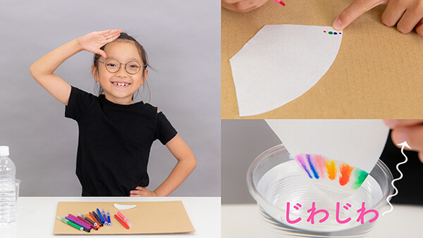 続いて小学3年生の澤井晴ノ(はの)さん(8歳)がチャレンジしたのは、水性カラーペンのインクの色を分解するアートな実験。はさみでカットしたコーヒーフィルターにペンで点を描き、コーヒーフィルターの端を水に浸します。すると、水が染み込んで広がり、ペンで描いた点が変化するようすが観察できます。