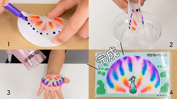 - ・実験からわかること:水性カラーペンのインクの中にさまざまな色の成分が使われていること。紙に水をつけると水を吸い上げる力がはたらくこと