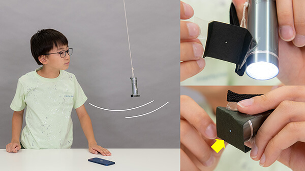 中学生向けの実験にトライしたのは、小学5年生の中村具楽(ぐら)さん(10歳)。ミニライトをつり下げた振り子を揺らし、光の軌道をスマホまたはデジカメで撮影します。振り子がどのような軌道を描いているのかを観察する実験ですが、果たしてきれいに写すことはできるのでしょうか。