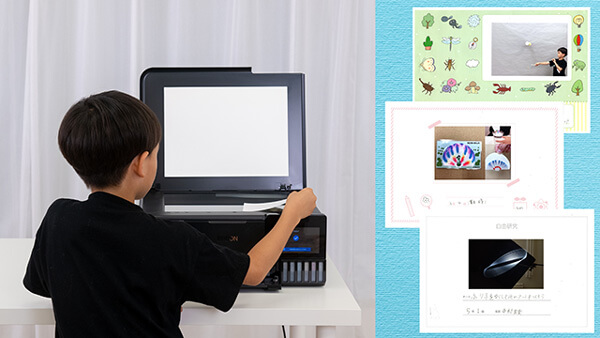 自由研究の表紙には、写真をプリントして貼り付けると、一目で何の研究か伝わって印象もUP。実験の途中など見せたいところの写真をプリントして貼ることで、まとめの完成度を上げることができました。手描きのイラストを大きく使いたい、まとめ用紙に合わせて図表を縮小したいといった時も、プリンターのコピー機能でサイズ調整すればスムーズです。