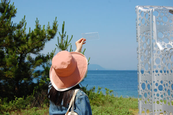 鑑賞キットの中には、メッセージが印字された透明カードが同封されています。このカードには、ベネッセアートサイト直島を訪れた人々に、瀬戸内ならではの豊かな自然・それと調和する建築とアートのある場で考えていただきたい、それぞれにとっての「よく生きるとは何か?」というメッセージが込められています。このカードを作品や自然景観などに重ね合わせて見ながら、好きなように視界を切り取ってみると、自分が大切にしているものに気付いたり、これからの人生のステップについて考えるきっかけになるかもしれません。