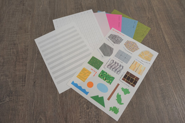 表現するツールは、文字以外の手法にも広げられるよう、複数用意されています。水に溶ける水用紙、自然のものから名前がつけられた色紙、卵の殻から作られた方眼紙・五線譜などです。感じたことや考えたことは、音楽や数字などで表現でき、何に書くのかも自由です。自分の感覚やイメージに合うものを選ぶことで感性や表現の幅も広がります。