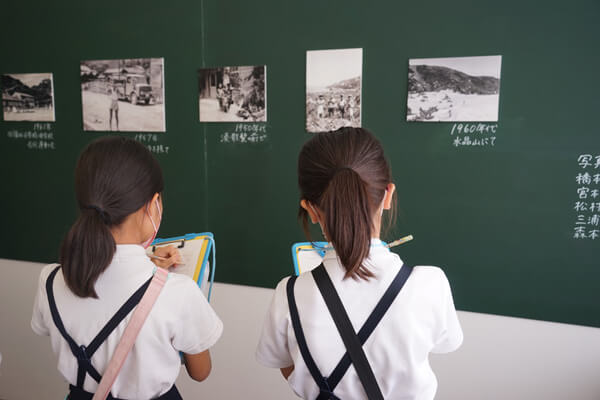 児童はまず、かつての福田地区の様子を写した写真展「福田からのお手紙」展を鑑賞しました。