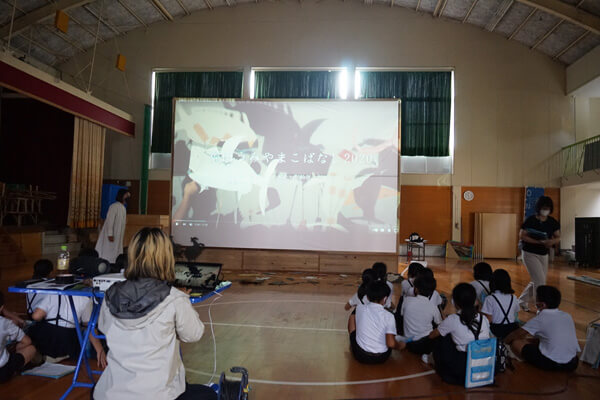 児童たちは、福田の影絵芝居が完成するまでのプロセスの話をスタッフから聞いたり、実際の上演の様子を映像で観たりしながら、地域の魅力を掘り起こすプロジェクトについて学びました。