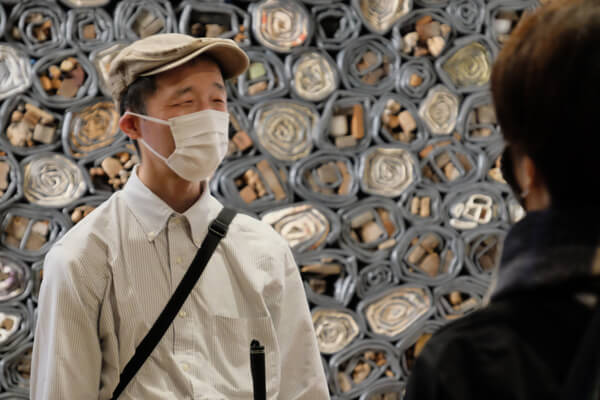 今回鑑賞したヤニス・クネリス「無題」では、「食べ物に見える」という参加者の発言から、「家庭によって食事の好みや習慣も違う」、「確かにお茶碗もいろんなものがある」などと、日常生活や食文化について話が広がっていったり、以前にもこの作品を鑑賞したことのあるリピーターのかたは「何度も見ているので先入観を取り除くのは難しいけれど、何も中に巻かれていないパーツがあるのは今日初めて気付いた」など、白鳥さんを中心として参加者同士が話すことで新しい発見が得られたりする場面もありました。