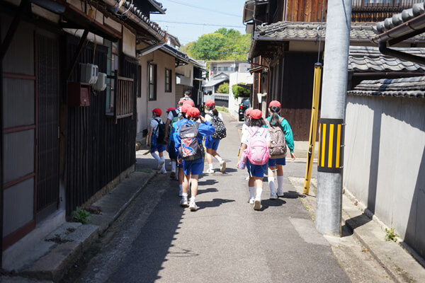 「ふるさと学習」で本村を散策する直島小4年生の児童たち