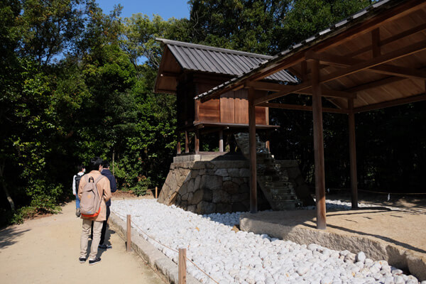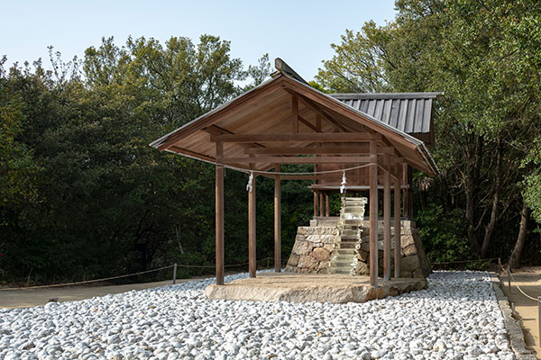 杉本は神社の設計にあたり、伊勢神宮など古代の神社建築の様式を参考にします。巨木や岩、山そのものといった自然に神が降臨するという日本古来の考えを重んじ、護王神社においては拝殿に巨石を配置することを考えます。巨石は重さ24トンの花崗岩で、神が宿るとされる磐座(いわくら)に相当します。