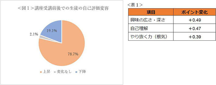 トライアル授業を受講した生徒のアンケートからは、非認知能力を含めた自己評価全体について、受講前の数値と全講座受講後の数値との差分平均値から37名(78.7%)の自己評価が向上していることがわかりました。