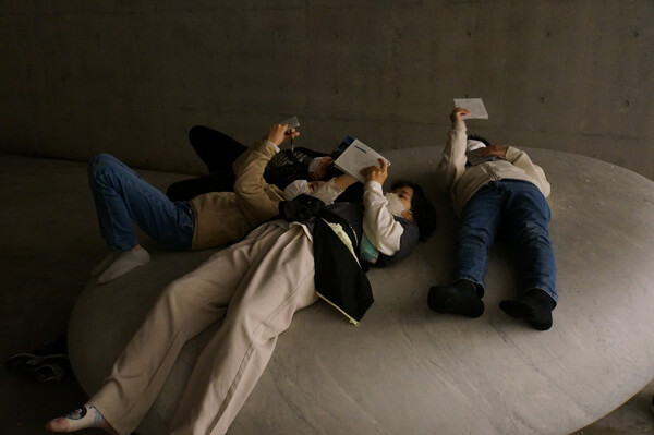 天井が空に開かれた作品≪天秘≫では風が吹くと空から桜の花びらが舞い落ちてきたり、空が暗くなるにつれて海と空の境界線が曖昧(あいまい)になっていったり、大きなガラスの開口部に館内の作品が反射していたり、訪れた季節や夜という時間帯ならではの特徴を見つけることができました。