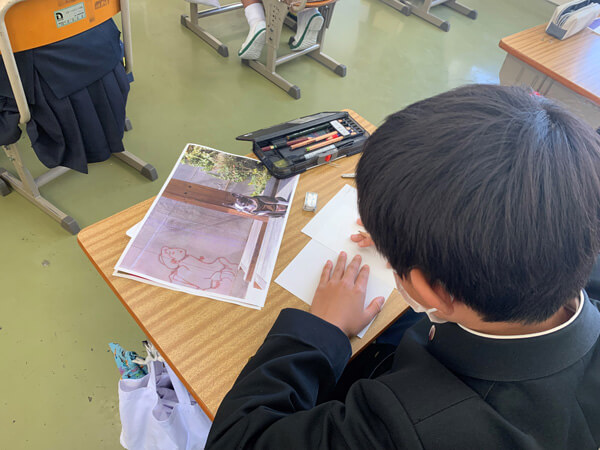 まず児童たちは、生活の中で自分なりの視点を切り取った写真を撮影し、その中から2枚を選びました。1枚は暮らしの場面、もう1枚は直島のアートの写真です。