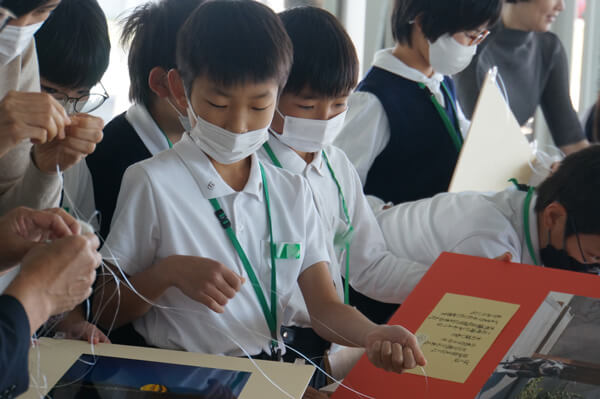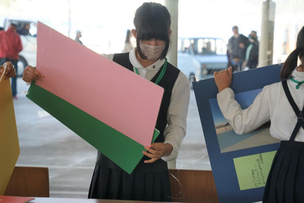 写真や言葉を配したパネルの展示作業は児童も参加しました。お客さまが見やすい高さに調整しながら展示していきます。