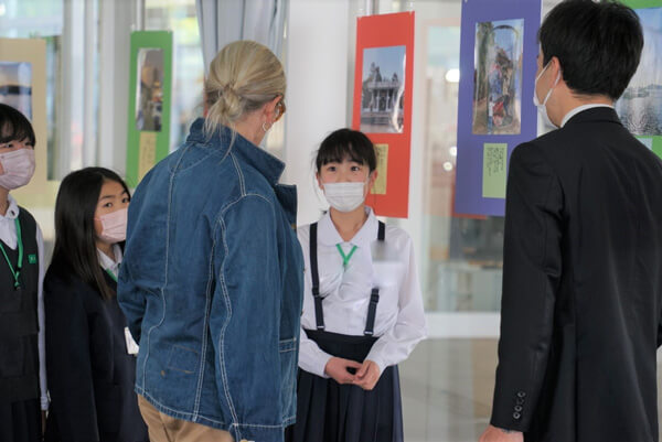 児童たちは授業の活動時間を使って、写真展へのお客さまの誘導や写真の説明を行いました。海外からの観光客にも自然に英語でガイドをする姿は、普段から外国人観光客をお迎えしている直島の児童ならではの光景です。