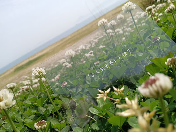 鑑賞キットには「よく生きるとは?」とメッセージが印字された透明のカードも同封されており、風景や作品を背景に透かして見ることができます。