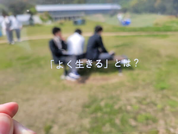 生徒たちは透明のカードを手に、自分にとっての「よく生きる」を表す背景を見つけて写真を撮影し、その背景を選んだ理由を添えて投稿するワークを行いました。