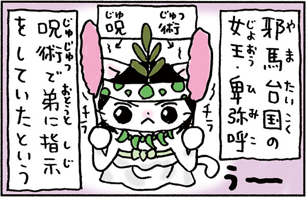 初めにつくったキャラクターは卑弥呼です。当時の衣装や、卑弥呼にまつわるエピソードから時間をかけてキャラクターに落とし込んでいったところ、かわいいキャラができあがりました(上のイラスト参照)。キャラクターができると、ネタやギャグで命を吹き込んでいけるんですよね。争いを止めようとねこじゃらしの呪術を使ったりと、ネコ版卑弥呼が肉付けされていきました。