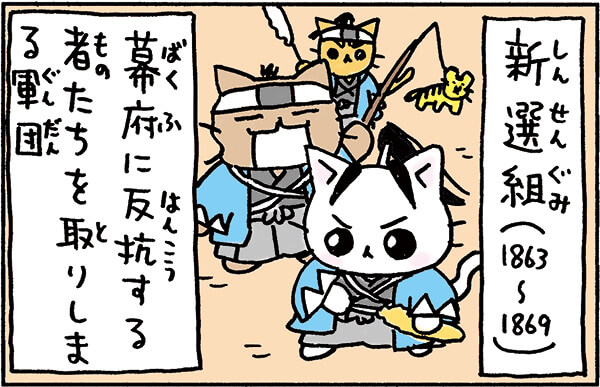 新選組は人物それぞれキャラクターがハッキリしているため、まずは、一人ひとり違う種類のネコに当てはめていきました。そのうえでキャラクター付けをするのですが、ポイントは人物の特徴を無理なくネコに置き換えること。無理のない自然なキャラ付けだと子どもも理解しやすく、入り込みやすいんですよね。