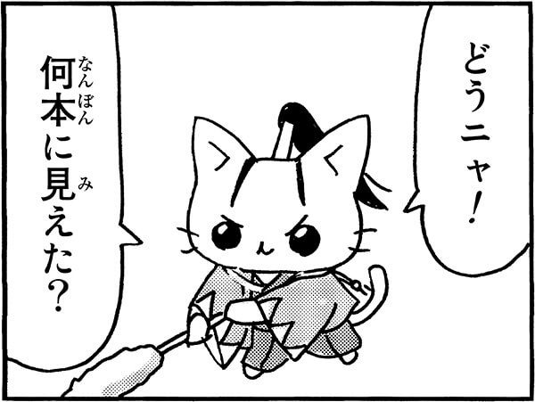 合戦もネコのケンカとして描くので、そもそも殺し合いまでには発展しないんですよね。とはいえ、ネコがかわいそうに見えないようには注意しています。ポイントは、ネコの特性を生かした合戦にすること。槍や刀でなくふわふわなねこじゃらしで戦ったり、鉄砲でなくまたたび砲で戦ったり、大きな音や水が苦手で逃げてしまったり……。そんなふうにネコの特性をふんだんに取り入れて描くと、合戦の生々しさより、かわいさが際立ってきます。