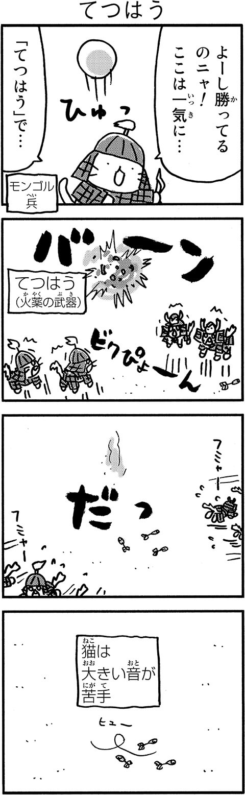 元寇(げんこう)で「てつはう(火薬を使った武器)」が使われたシーンを描いた4コマ。ネコは大きい音が苦手という特性を踏まえて逃げ出してしまったというオチに。
