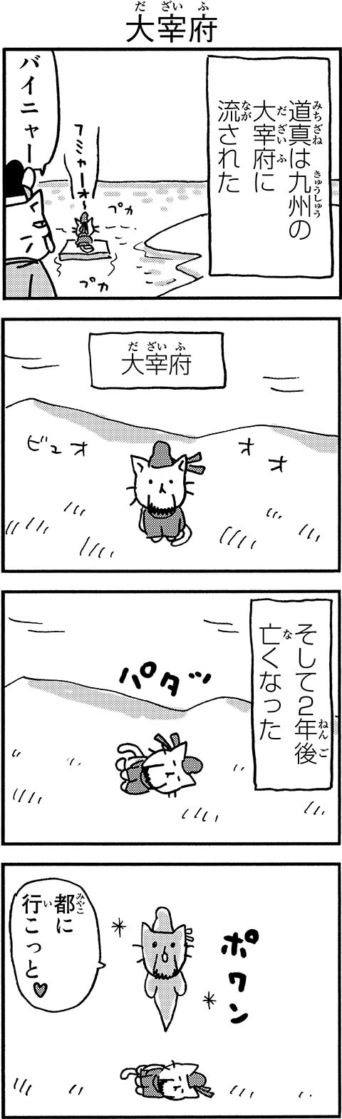 人物が亡くなることも悲しく見えないように工夫しています。よく使っているのが、亡くなった人物が昇天して幽霊として登場するという方法です。かわいい幽霊キャラができると、ギャグになるんですよね。菅原道真の幽霊キャラ(下の4コマ参照)が登場すると、たたりも怖すぎずポップな印象になりました。