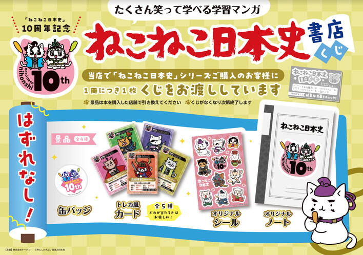 現在、全国309店舗の書店で10周年を記念したフェアを開催中で、はずれなしの書店くじを実施しています(※くじがなくなり次第終了します)。くじは『ねこねこ日本史』シリーズの商品を1冊購入ごとに1枚進呈。くじに記載された商品を1つもらえるので、ぜひ参加してみてください。