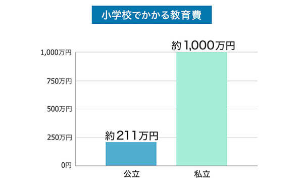 前述した文部科学省の調査では、小学校6年間の学習費は、公立で211万2,022円、私立で999万9,660円となっています。