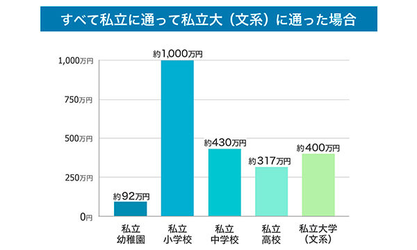 幼稚園から大学までの約20年間を私立で通すとなると、学費の合計は約2,200万円に上ります。